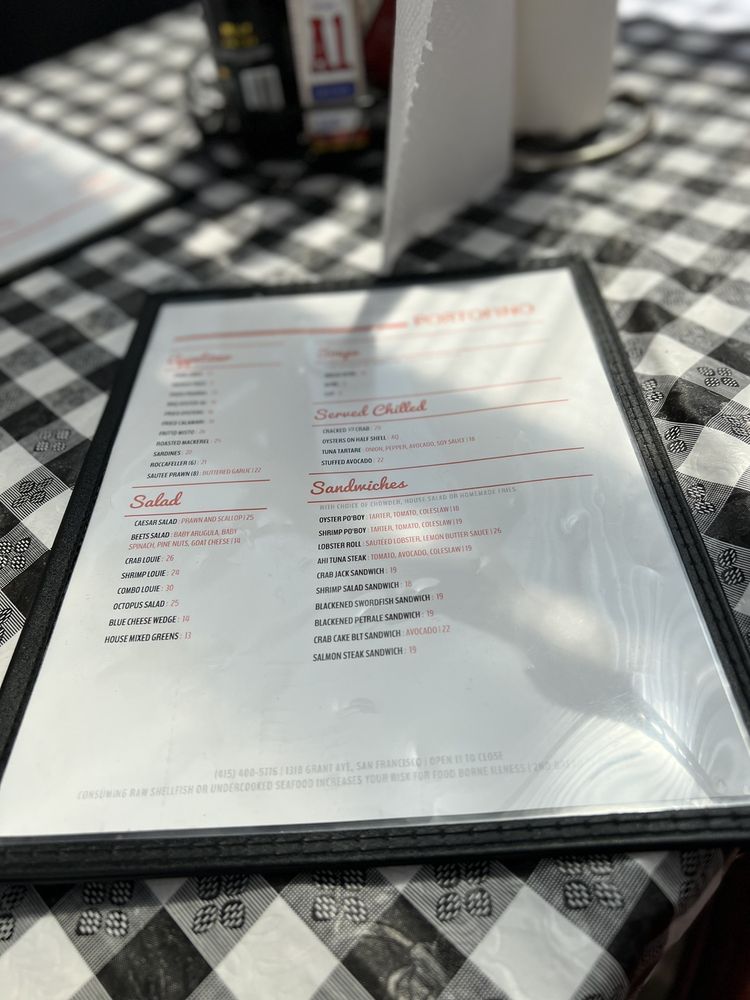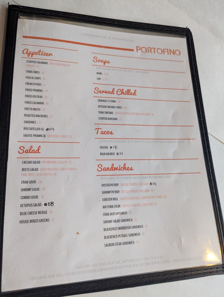 "Portofino" at 1318 Grant Ave San Francisco, CA offers a casual and trendy dining experience with outdoor seating and waiter service. The ambiance is vibrant, with positive reviews highlighting the fresh oysters, linguine with shrimp, and sizzling sardines. Customers appreciate the reasonable prices and friendly service, particularly mentioning the helpful owner and staff like Frankie. While some minor mix-ups have occurred with orders, the overall dining experience is praised for its chill and homey atmosphere. With a varied menu and tasty dishes like the lobster roll and Cioppino, "Portofino" is a must-try spot for those looking for flavorful Italian cuisine in San Francisco.